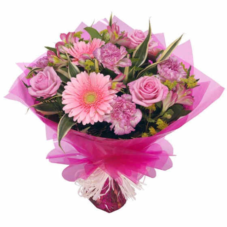 Make someone's day with this delightful display of pretty pink blooms including pink Roses, pink Gerberas, Carnations and Alstromeria presented as a hand-tied bouquet in an aquapack for instant display.